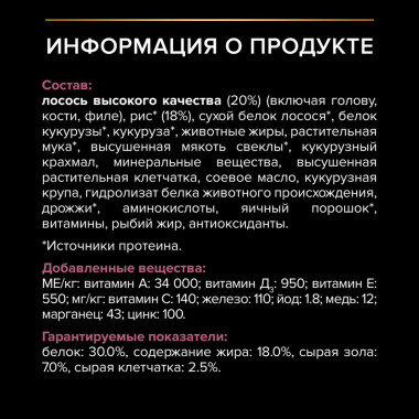 лосось высокого качества (20%) (включая голову, кости, филе), рис* (18%), сухой белок лосося*, белок кукурузы*, кукуруза*, животные жиры, растительная мука*, высушенная мякоть свеклы*, кукурузный крахмал, минеральные вещества, высушенная растительная клетчатка, соевое масло, кукурузная крупа, гидролизат белка животного происхождения, дрожжи*, аминокислоты, яичный порошок*, витамины, рыбий жир, антиоксиданты.