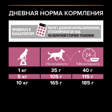 Индивидуальную норму кормления собаки с учетом ее возраста, размера и индивидуальных потребностей вы можете рассчитать в специальном калькуляторе. Для этого сканируйте QR-код на обратной стороне упаковки. Если вы впервые переходите на корм PRO PLAN®, воспользуйтесь рекомендациями по переводу питомца на корм PRO PLAN® в карточке товара.
