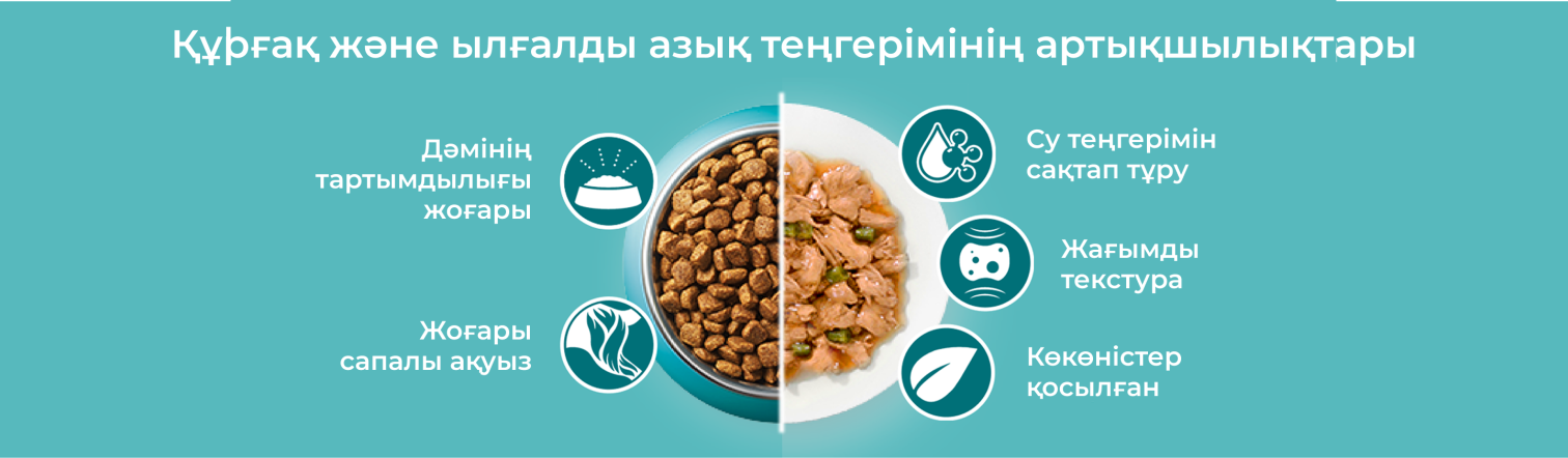 Үй жануарыңыздың қажеттіліклерін ескере отырып жасалған дымқыл азықтармен құрғақ рационды толықтырып, Purina ONE® брендімен бірге дұрыс тамақтандырыңыз. Азықтандыру нормалары бойынша қаптамадағы ұсыныстарды орындаңыз.