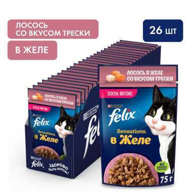 Желедегі FELIX® Sensations азығы — асырандыңызға арналған тәбетті дәмдердің желісі. Желедегі FELIX® Sensations азығы — бұл азықты Сіздің асырандыңыз үшін одан да дәмдірек, тәбеттірек және тартымдырақ ететін хош иісті желедегі нәзік кесектер. Азық Сіздің мысығыңыздың күнделікті қажеттіліктерін толығымен қанағаттандыру үшін минералды заттар мен дәрумендердің дұрыс үйлесімі бар қажетті Омега-6 май қышқылдарының көзі болып табылады.